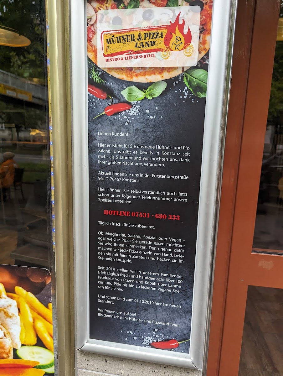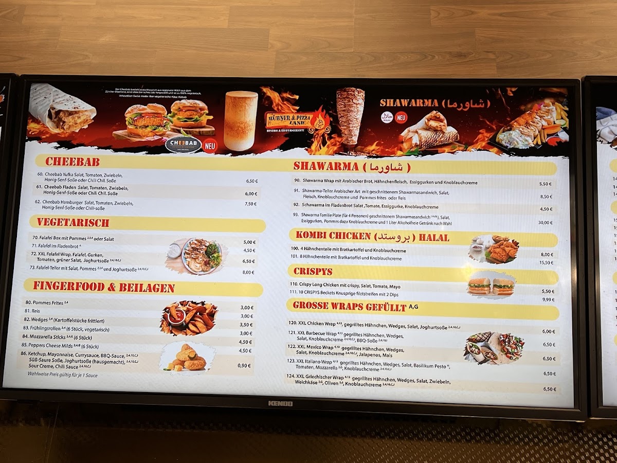 Welcome to Hühner & Pizzaland Konstanz, nestled in the heart of Konstanz at Zähringerpl. 6-8. This inviting eatery is a treasure trove for food lovers, particularly for those craving authentic Döner and pizza. Patrons rave about the delicious chicken döner, a beloved staple, and the ever-popular Shwarma. The menu also extends to vegan options, such as the seitan kebab and tasty vegan pizza, showcasing a commitment to diverse dietary preferences, though some dishes have been critiqued for saltiness.